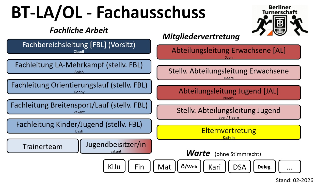 Wir sind eine bunte Leichtathletik- und Orientierungslauf-Gruppe. Im Rahmen des Großvereins Berliner Turnerschaft und bieten quer durch alle Altersklassen ein breites Trainingsangebot angefangen vom Walkingtreff, über Mehrkampf- und Orientierungslauftraining. Wir betreiben Leichtathletik aus Überzeugung – WIR fördern JEDE/N individuell im Rahmen seiner und unserer Möglichkeiten – „Talent“ ist schön aber nicht so wichtig.
